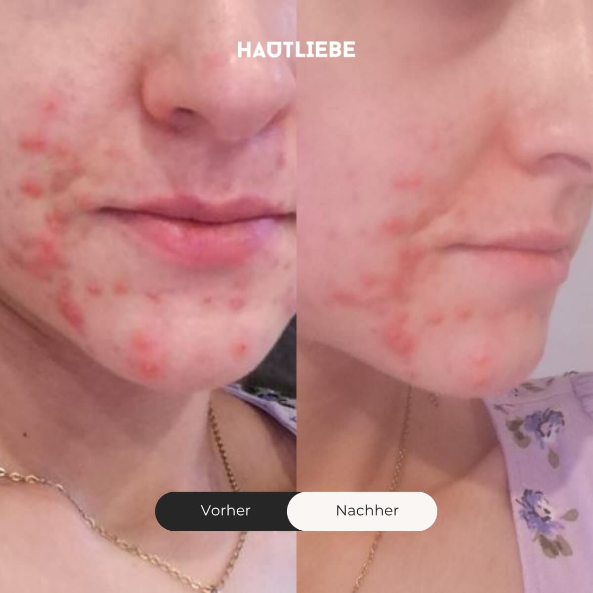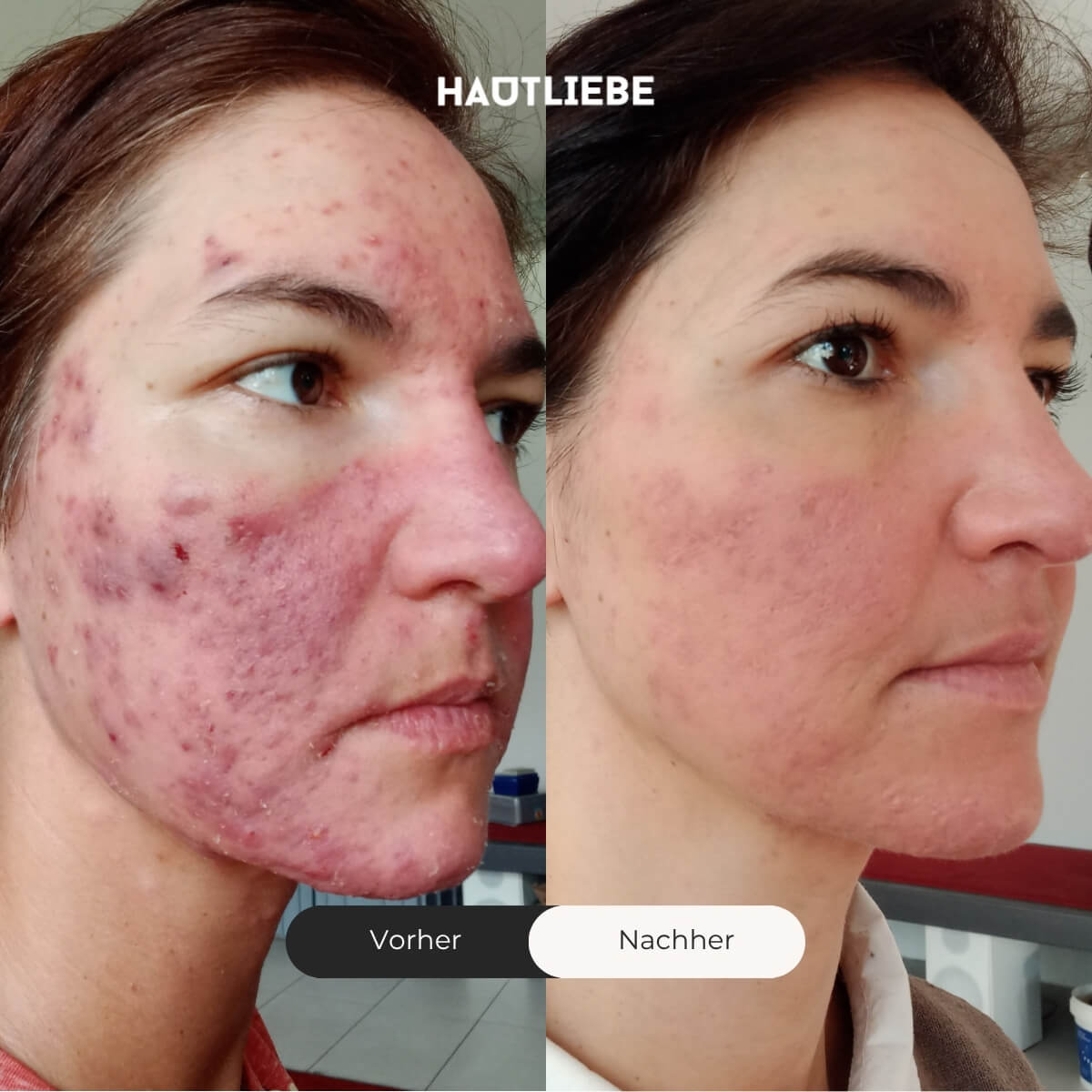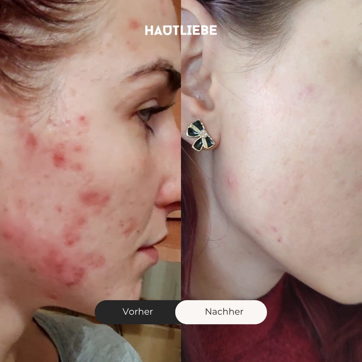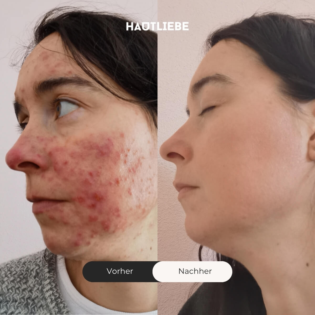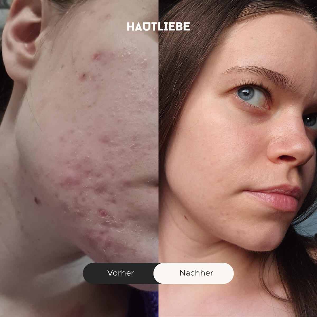Ich bin durch Zufall über Hautliebe gestolpert und habe mir direkt das Hautliebe Ritual bestellt. Schlimmer konnte es nicht werden und ein Versuch war es wert. Innerhalb von vier Tagen sind die Rötungen verschwunden, bis der schlimmste Teil der Akne abgeklungen ist ca. einen Monat. Nur die Entzündungen brauchen etwas länger und ab und zu taucht noch eine auf, aber das ist ok. Veränderung passiert nicht über Nacht. Mein Hautbild hat sich deutlich verbessert, ich habe so gut wir keine Akne und Rötungen mehr und meine Poren sind deutlich kleiner geworden. Ich bin sehr zufrieden und bleibe definitiv bei Hautliebe