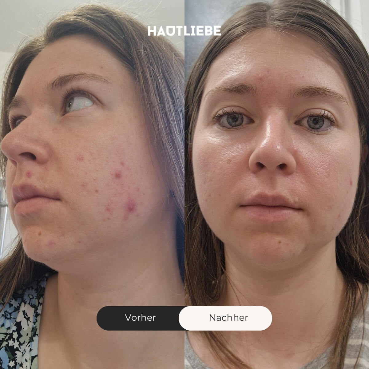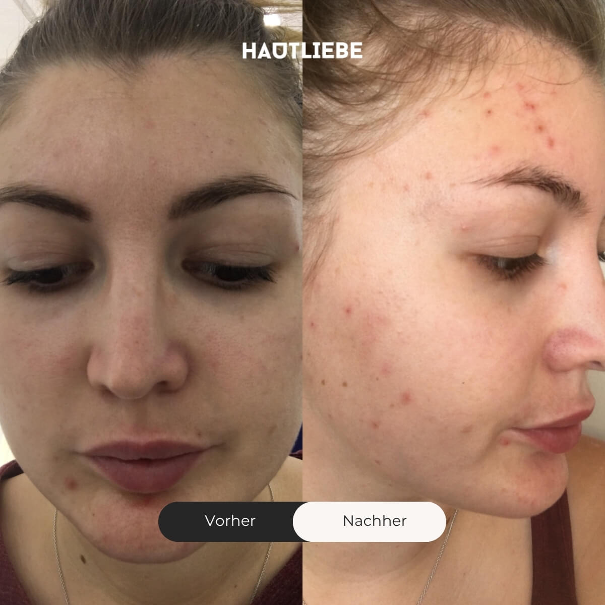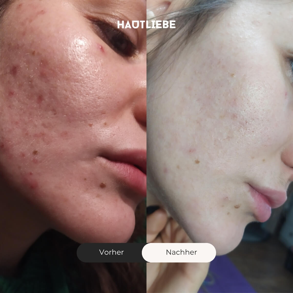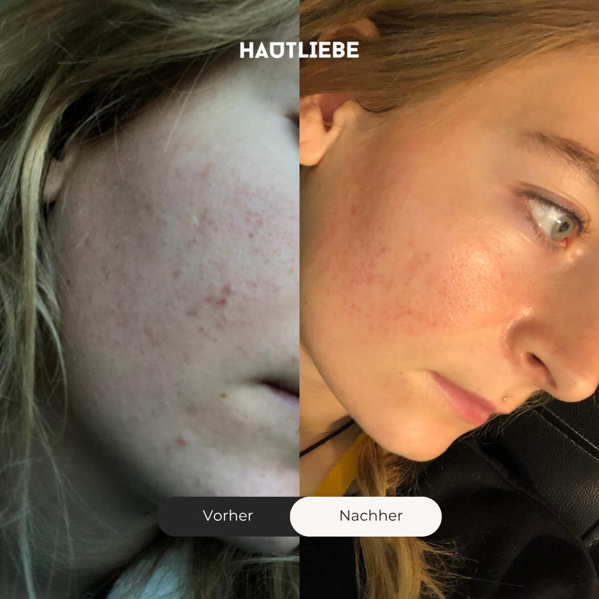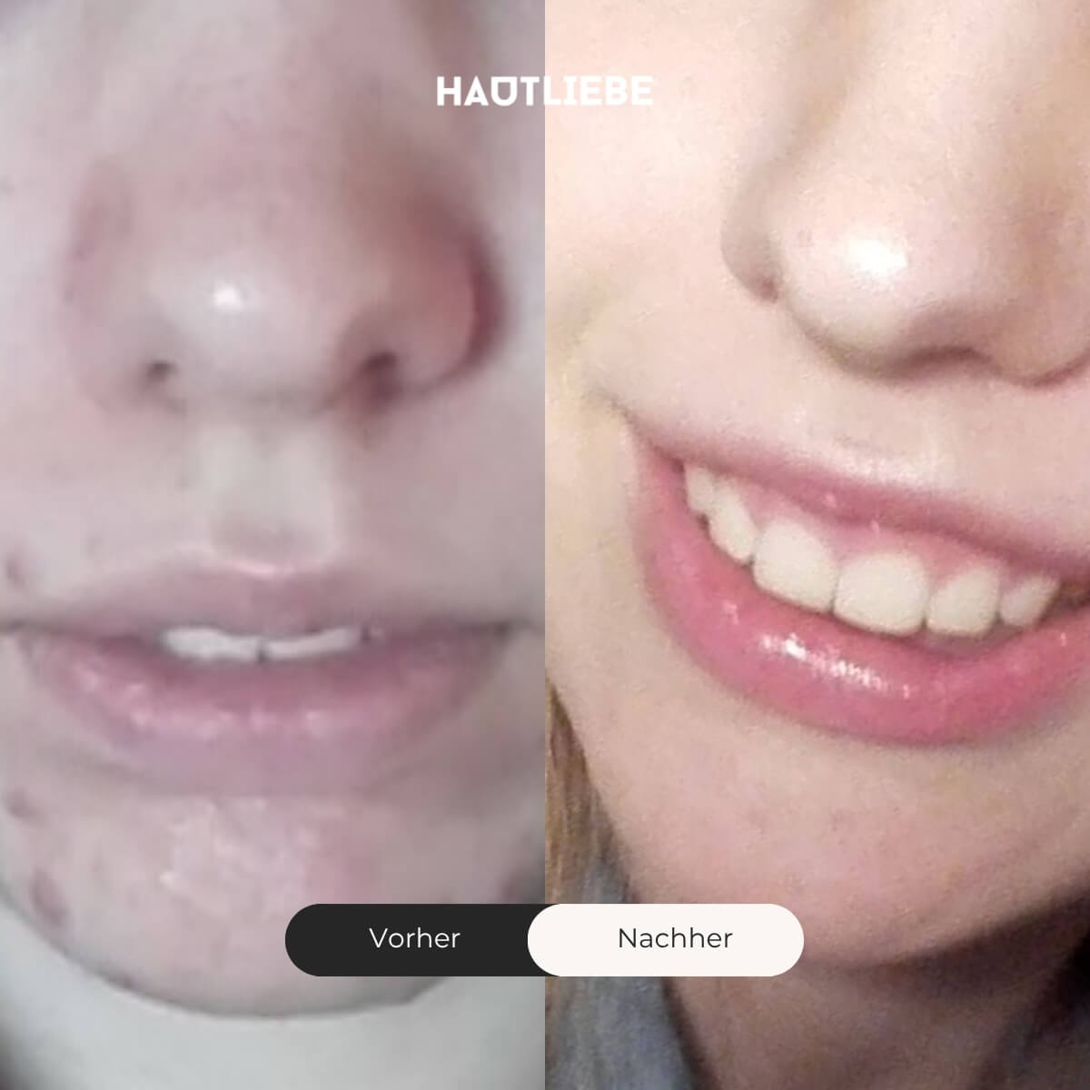 Ich bin durch Zufall über Hautliebe gestolpert und habe mir direkt das Hautliebe Ritual bestellt. Schlimmer konnte es nicht werden und ein Versuch war es wert. Innerhalb von vier Tagen sind die Rötungen verschwunden, bis der schlimmste Teil der Akne abgeklungen ist ca. einen Monat. Nur die Entzündungen brauchen etwas länger und ab und zu taucht noch eine auf, aber das ist ok. Veränderung passiert nicht über Nacht. Mein Hautbild hat sich deutlich verbessert, ich habe so gut wir keine Akne und Rötungen mehr und meine Poren sind deutlich kleiner geworden. Ich bin sehr zufrieden und bleibe definitiv bei Hautliebe