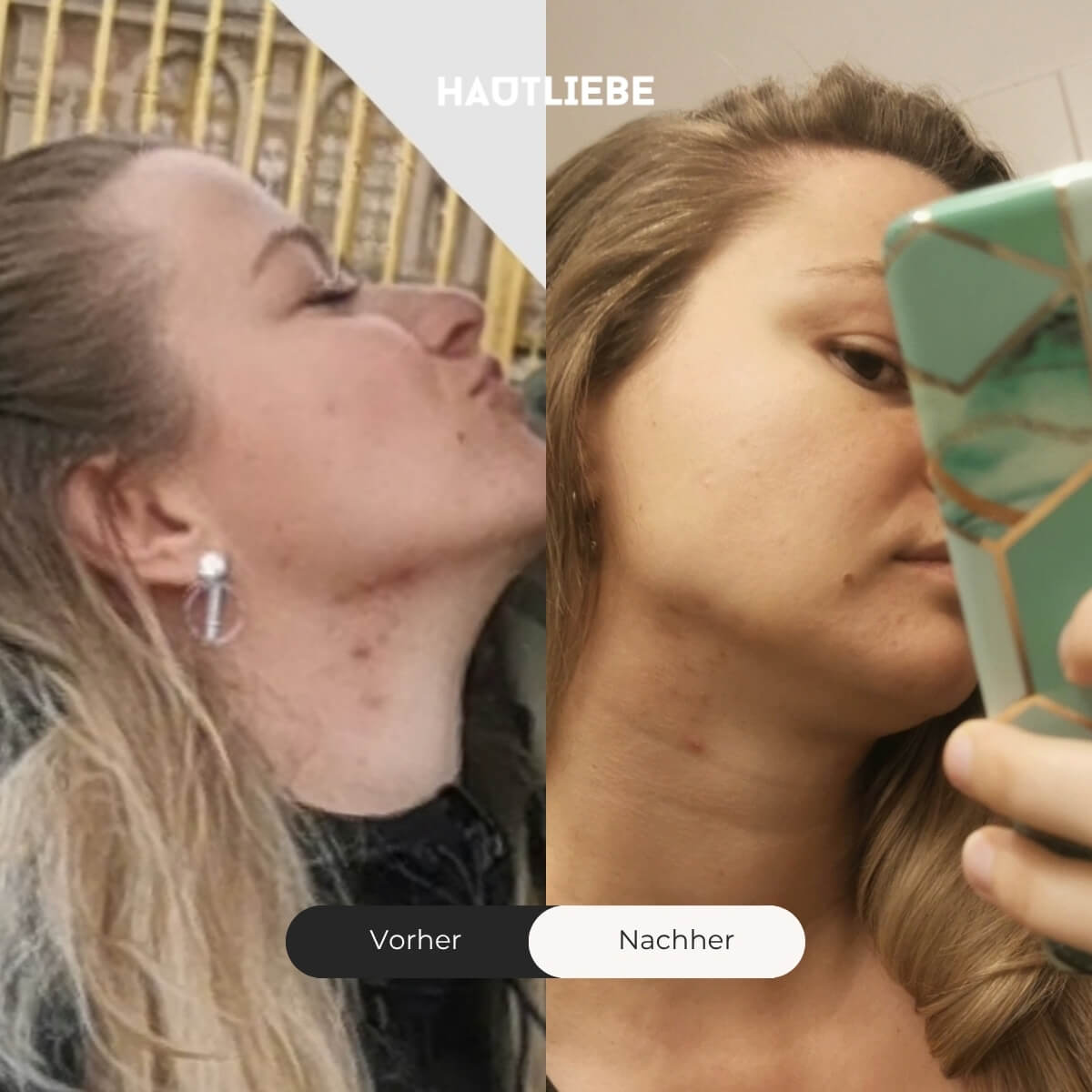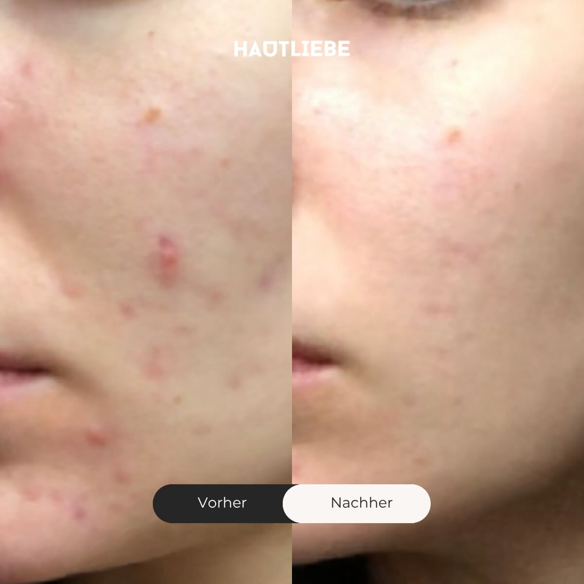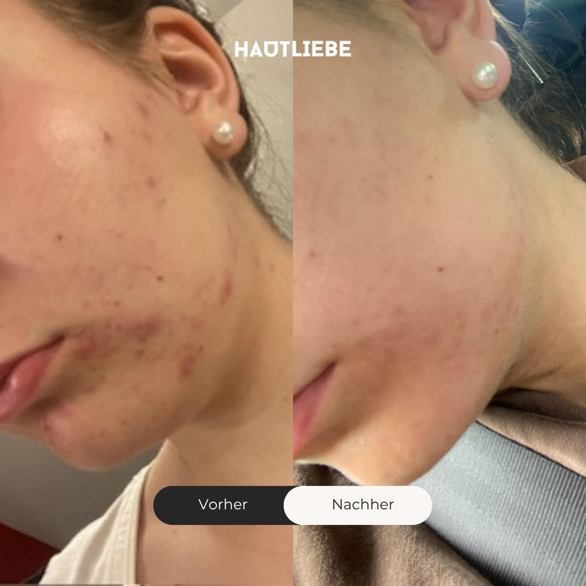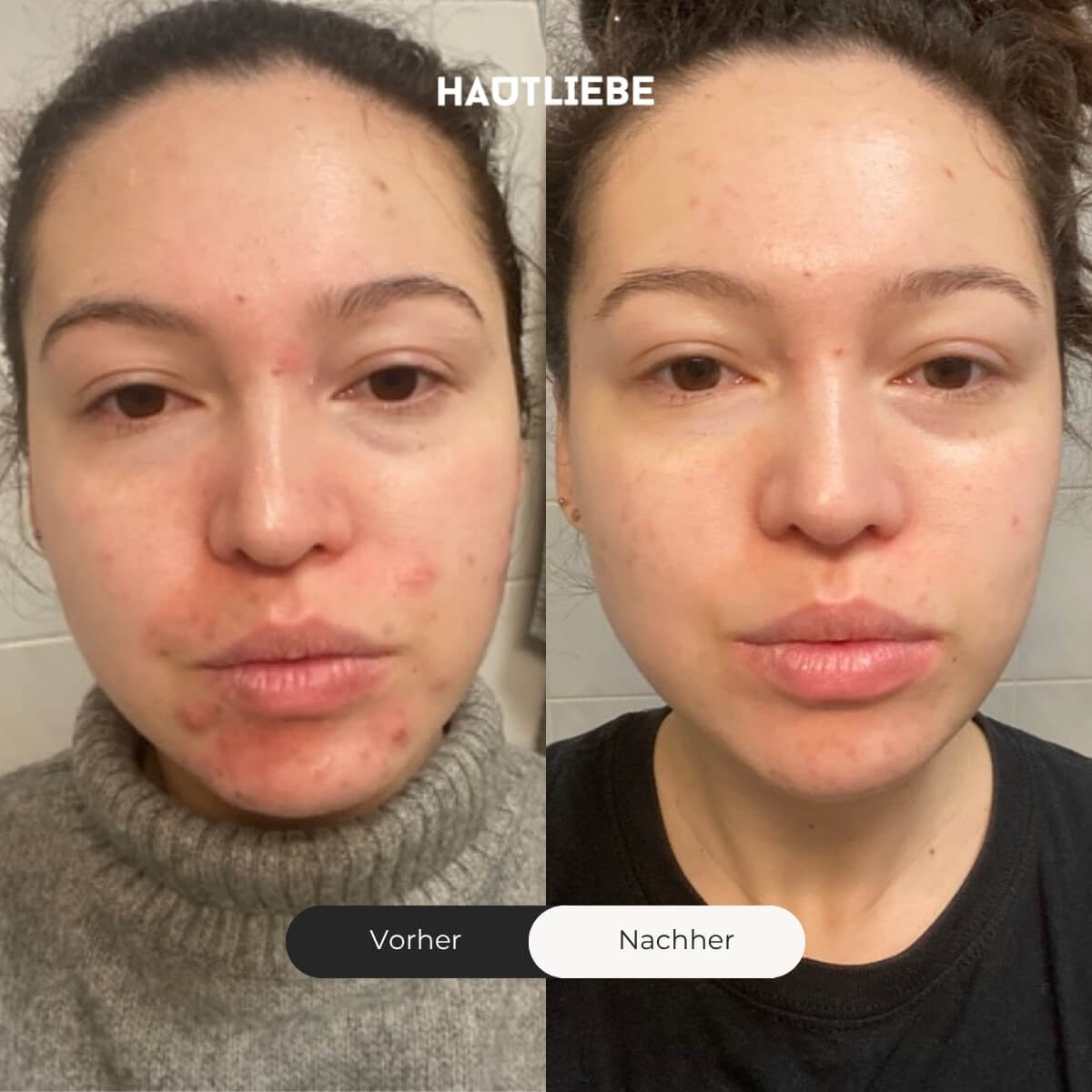 Ich bin durch Zufall über Hautliebe gestolpert und habe mir direkt das Hautliebe Ritual bestellt. Schlimmer konnte es nicht werden und ein Versuch war es wert. Innerhalb von vier Tagen sind die Rötungen verschwunden, bis der schlimmste Teil der Akne abgeklungen ist ca. einen Monat. Nur die Entzündungen brauchen etwas länger und ab und zu taucht noch eine auf, aber das ist ok. Veränderung passiert nicht über Nacht. Mein Hautbild hat sich deutlich verbessert, ich habe so gut wir keine Akne und Rötungen mehr und meine Poren sind deutlich kleiner geworden. Ich bin sehr zufrieden und bleibe definitiv bei Hautliebe