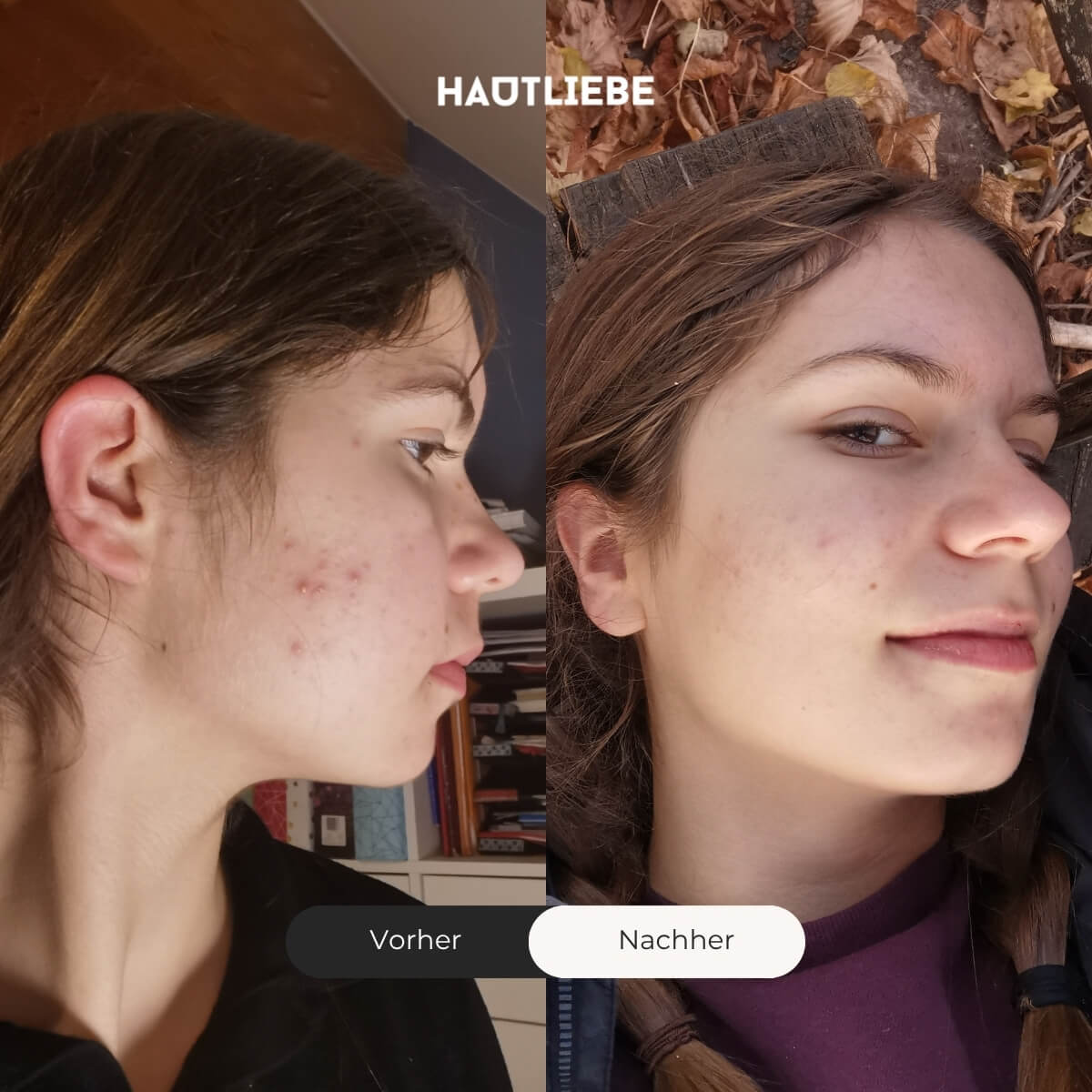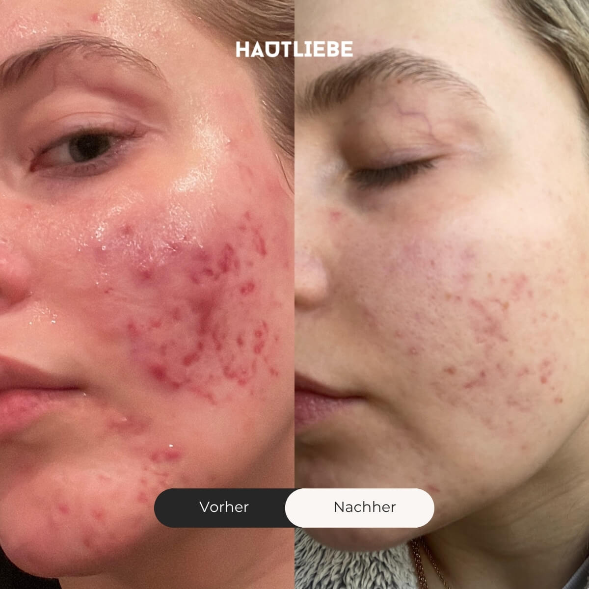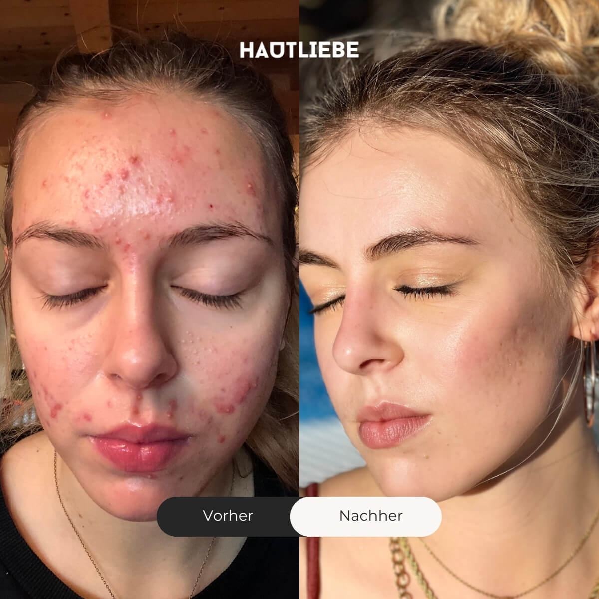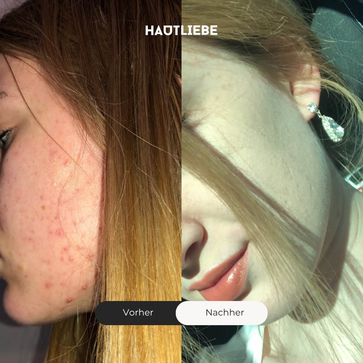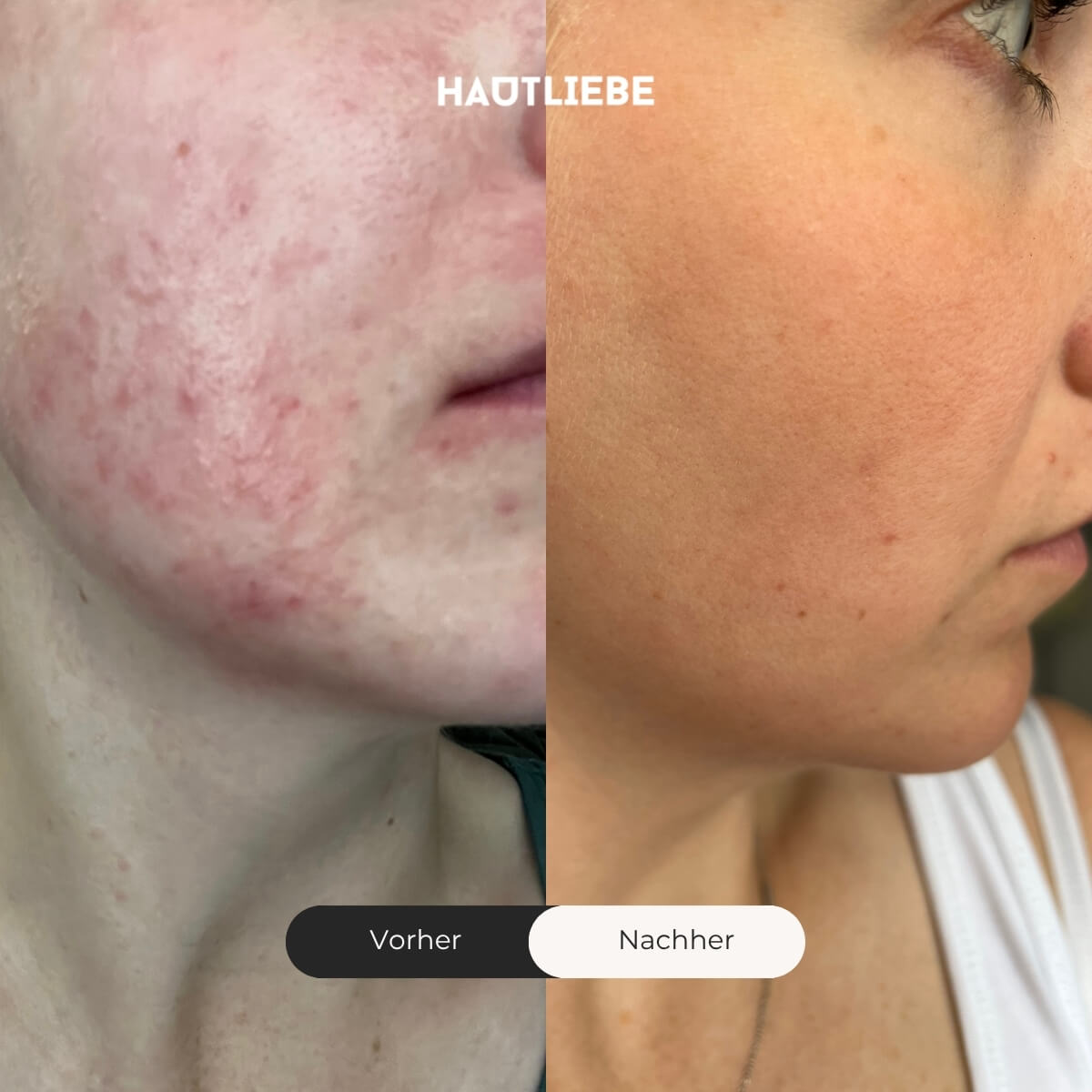 Ich bin durch Zufall über Hautliebe gestolpert und habe mir direkt das Hautliebe Ritual bestellt. Schlimmer konnte es nicht werden und ein Versuch war es wert. Innerhalb von vier Tagen sind die Rötungen verschwunden, bis der schlimmste Teil der Akne abgeklungen ist ca. einen Monat. Nur die Entzündungen brauchen etwas länger und ab und zu taucht noch eine auf, aber das ist ok. Veränderung passiert nicht über Nacht. Mein Hautbild hat sich deutlich verbessert, ich habe so gut wir keine Akne und Rötungen mehr und meine Poren sind deutlich kleiner geworden. Ich bin sehr zufrieden und bleibe definitiv bei Hautliebe