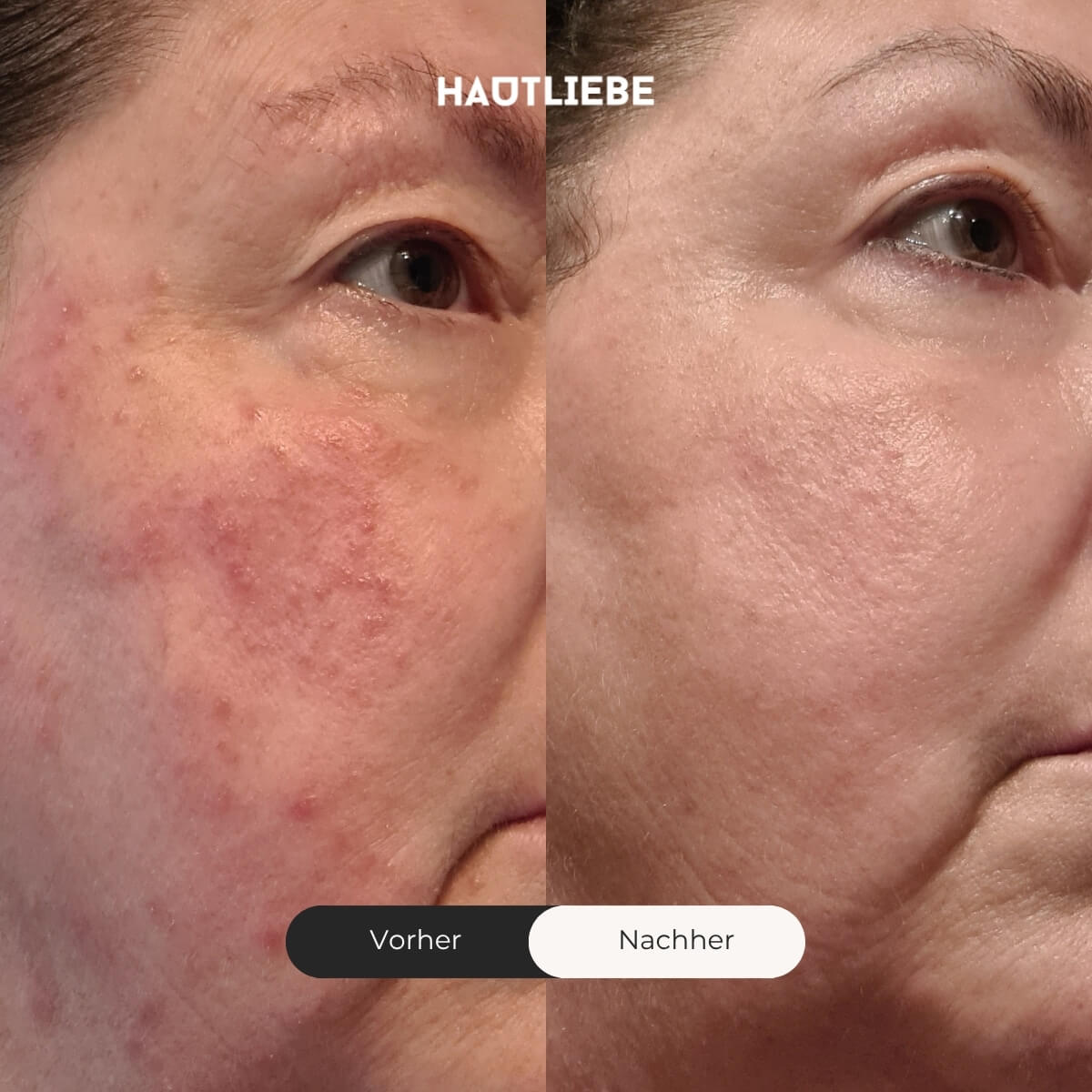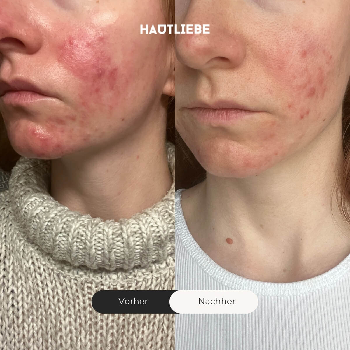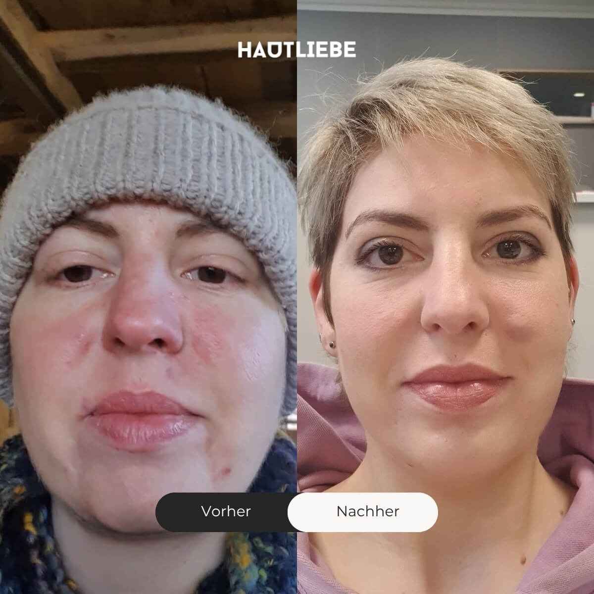 Ich habe seit mehr als 4 Jahren Rosacea und war bei verschiedenen Ärzten, die mir Kortison Cremes verschrieben hatten. Diese brachten aber gar keine Verbesserung. Da es mich ziemlich stört und mit der Zeit immer schlimmer wurde, suchte ich nach einer Lösung. Als ich auf Hautliebe gestoßen bin, war ich erst skeptisch, aber es war einen Versuch wert. Nach einer Woche merkte ich schon einen Unterschied, da die Pickel zurückgingen. Mittlerweile nehme ich es jetzt 4 Wochen und ich habe keine Pickel mehr und meine Wangen sind deutlich weniger rot. Ich benutze seit kurzem auch die Reinigungsprodukte von Hautliebe und lasse nichts anderes mehr an mein Gesicht. Ich würde es jedem empfehlen einmal auszuprobieren.