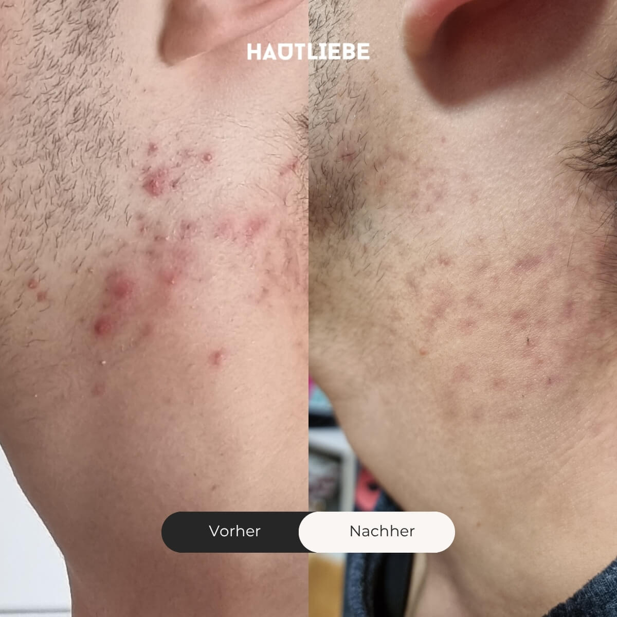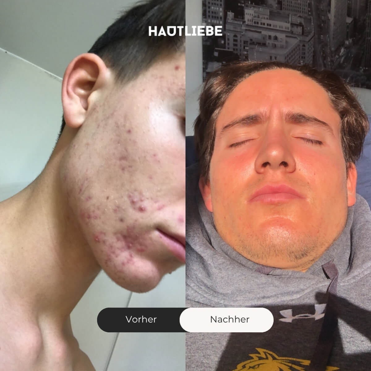 Die Haut war vor allem am Bart, am Nacken und am Rücken mit Pickeln betroffen. Ich habe vieles aus der Drogerie ausprobiert mit wenig Erfolg. Als ich beim Hautarzt mit den Tabletten konfrontiert wurde, habe ich nochmals recherchiert und bin auf Hautliebe gelandet. Da die Tabletten während des Sommers keinen Aufenthalt an der Sonne erlaubt hätten, habe ich mir bis September Zeit gegeben, das Produkt Hautliebe zu probieren. Innerhalb 4 Wochen habe ich die ersten positiven Ergebnisse gesehen. Nach 3 Monaten hatte ich 95% der Haut aknefrei. Wenn ich sehr strikt mit der Ernährung umgehe, bin ich sogar 99% aknefrei. Ich bin wieder gut gelaunt und muss meinen Nacken nicht mehr verstecken.
