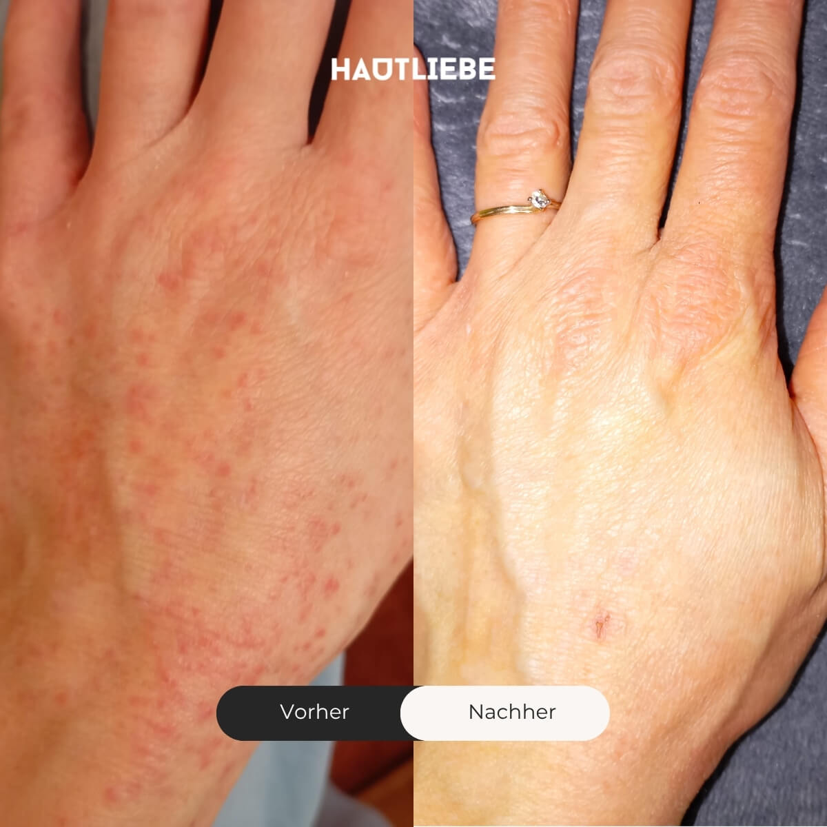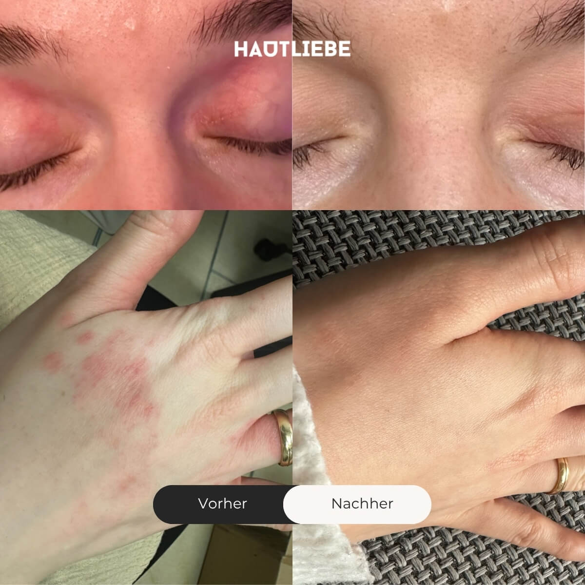 Habe seit letztem Jahr neurodermitis, und erst dieses mal einen heftigen Schub. So extrem war es bisher noch nie. Habe an den oberen Augenlidern den Ausschlag mit Jucken und kleinen Rissen bekommen und immer wenn ich cremes aufgetragen habe (auch ohne parfüm) ein starkes brennen empfunden. Meine augenlider waren immer sehr angeschwollen und durch dieses jucken/brennen haben meine augen ständig getrännt. Es war extrem unangenehm. Meine Hand hatte auch einen großen Neurodermitis Ausschlag, der immer gejuckt hat, sogar nachts bin ich vom Juckreiz wach geworden.Ich bin durch Zufall auf Elena / Hautliebe gestoßen und habe mir gedacht ok ich probiere es einfach mal aus. Verlieren kann ich eh nix. Habe die Tropfen und den Balsam bestellt, und jetzt nach nur ein paar Tagen Anwendung ist die Schwellung an den Augenlidern fast weg sowie die Risse und der Juckreiz hat sich auch beruhigt 🤗 es ist nicht komplett perfekt aber es ist nicht mal eine Woche Anwendung, also ich denke nach wochen und Monaten ist es einfach wieder eine schöne haut. An meiner Hand kann man sehr gut erkennen dass es was gebracht hat. So schnell🙏🏻 Ich finde aber auch generell die Tropfen und den Balsam sehr gut, weil ich selbst frühs wenn ich aufstehe noch das Gefühl habe dass meine Haut schön mit Feuchtigkeit versorgt ist, das hatte ich bisher bei noch keinem anderen Produkt. Das Renigungsöl habe ich zum ausprobieren auch bestellt und den Balsam nochmal für die Arbeit, damit ich ihn nicht immer mitschleppen muss. Fand das Öl auch sehr angenehm zur Reinigung. Ich bin gespannt wie sich meine Haut in den nächsten Wochen verändern wird aber ich bin jetzt schon total begeistert. Gerne weiter so und vielen Dank für die Entwicklung dieser schönen Produkte 🙏🏻