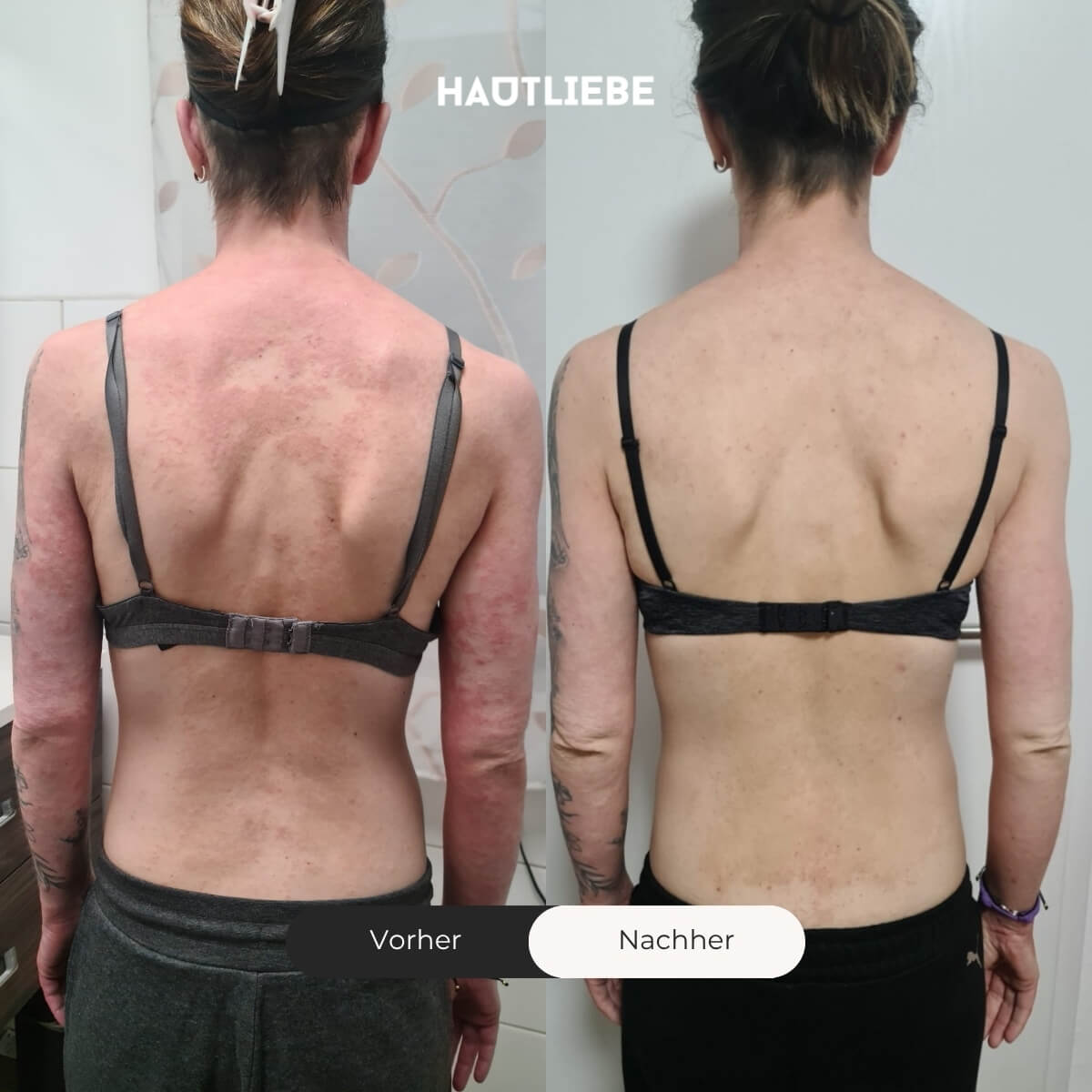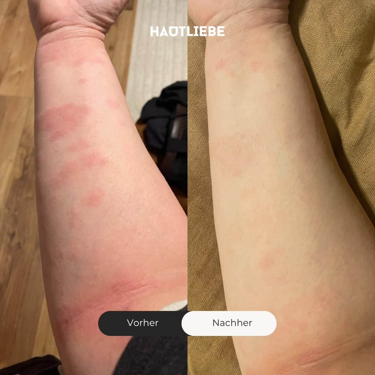 Meine Neurodermitis hat begonnen in der Pubertät. Meine Hände, Ginger, Ellenbogen und Gesicht waren stark betroffen. Nach etlichen Cortison küren ging es etwas besser, doch Weck war es nicht. Die Pille und das Ende der Pubertät haben geholfen und meine Haut würde wieder besser. Mit 30 setzte ich die Pille ab. Alles fing von vorne an. Schübe. Offene Stellen. Extrem Juckreiz. Ich bekam es ziemlich in denn Griff. Dann mit 32 würde ich schwanger. Wunderschöne haut. Alles gut. Nach der Geburt kam es extrem schlimm zurück. So schlimm war es noch nie. Der gesamte Oberkörper plus Gesicht und Kopfhaut war betroffen. Extrem schuppige Haut. Rote Flecken das man keine gesunde Haut mehr gesehen hat. Schlaflose nächte. Alles tat so weh. Allergietest, Allergietapeten und Schmerzmittel halfen nicht. Ich ging nicht mehr aus dem Haus. Musste mich alle 15 Minuten eincremen weil es so weh tat. Blutabnahme usw. Meine Haut und vor allem meine Psyche waren im tiefsten schwarzen Loch. Nicht Mal mehr das Cortison hat geholfen. Essen stellte ich um. Trank nur mehr Wasser aus Angst das es noch schlimmer wird. Im Sommer wurde es etwas besser doch Weck war es bis heute nicht. Jetzt kämpfe ich 1 Jahr damit. Keine einzige Nacht habe ich mehr gut geschlafen. Durch Hautliebe ging der Juckreiz relativ schnell Weck. Der Balsam ist sehr reichhaltig und gibt mir das Gefühl das ich nicht ständig Cremen muss. Erste Ergebnisse sah ich nach 2 Wochen. Es wurde besser. Die Haut ist nicht mehr so trocken. Sie schuppt nicht mehr so extrem. Ich kann jetzt wieder ohne Make-up das Haus verlassen. Mein Gesicht ist wieder schön. An denn händen dauert es noch.