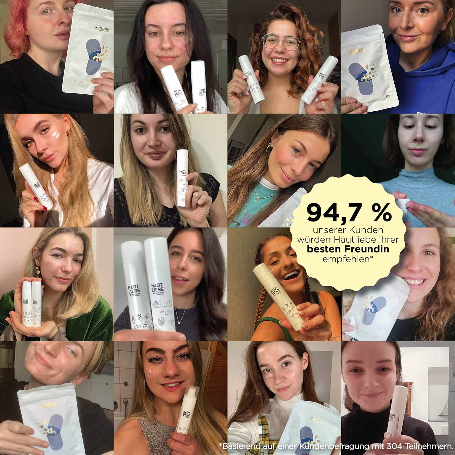Bisher hatte ich ständig mit Unreinheiten und starken Entzündungen zu kämpfen. Die Cremes haben das sehr deutlich verbessert. Wenn ich in den Spiegel schaue, bin ich sehr zufrieden Die Cremes haben sofort Verbesserungen gezeigt. Durch die Hautliebe Kapseln gab es nochmal eine enorme Veränderung. Ich bin sehr glückli